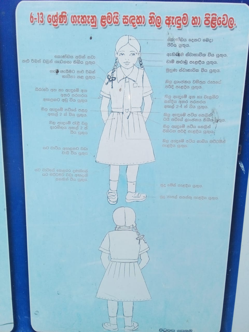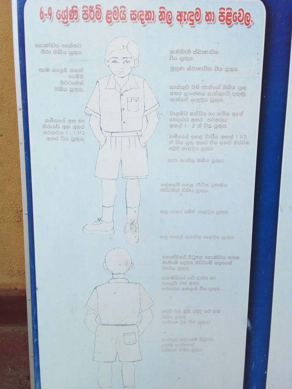 - නිල් පාට කොට කලිසම ඉන නාභිය දක්වාද පහළ කොටස දනහිසින් අගල් ෙදකක් ඉහලට තිබිය යුතුය.(ඉදිරිපස රැලි දෙකත් සහිතව)