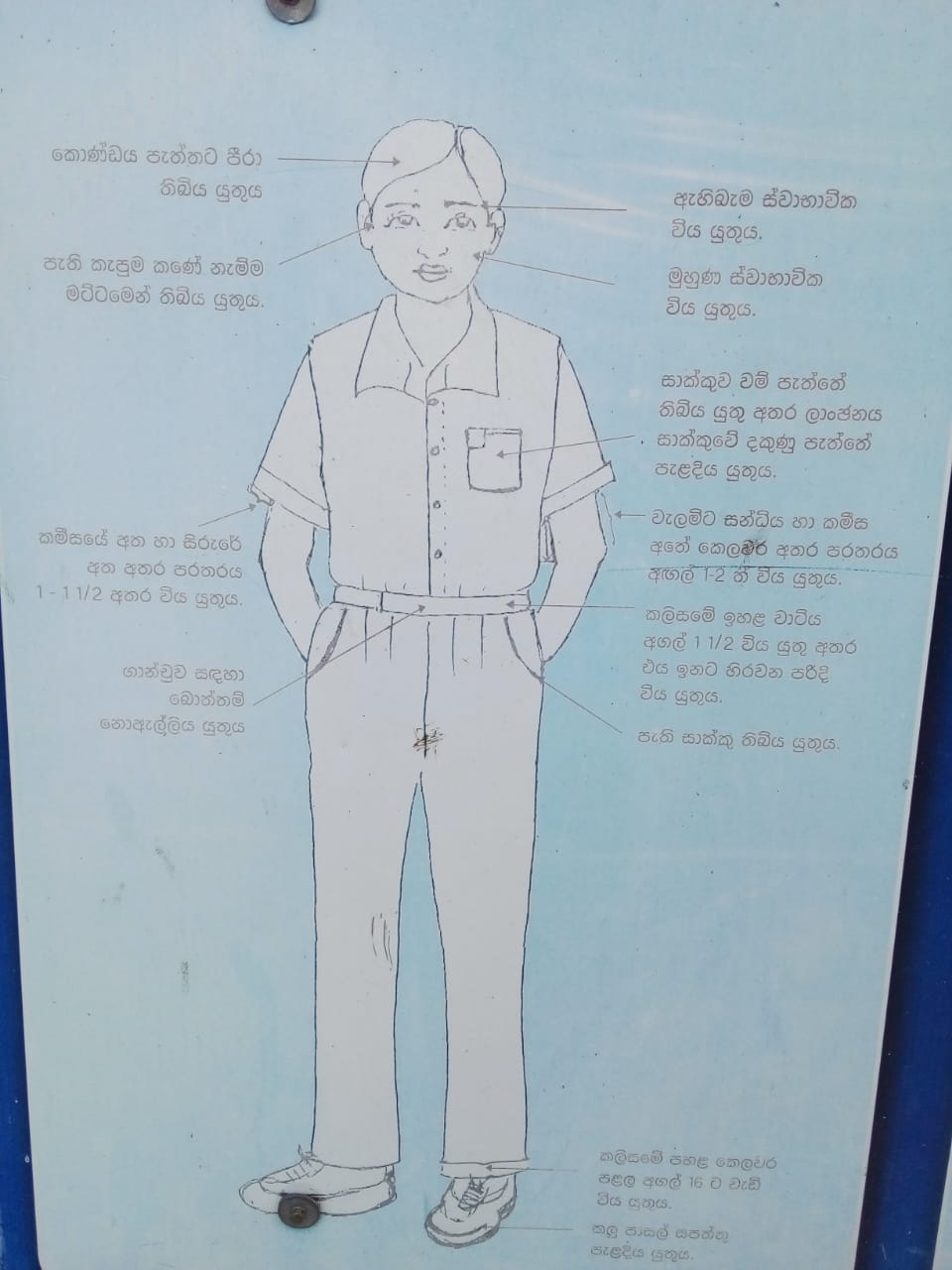 - සුදු මේස් හා කළු සපත්තු පැළඳිය යුතුය.